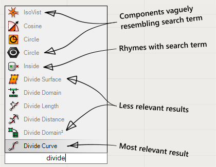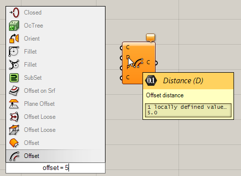 The double click popup windowfor inserting components accepts a number of different input formats. If youprovide a plain component name (or the abbreviation or a word used in thedescription) then you will see a list of potential matches, sorted from mostrelevant to least relevant: 双击弹出窗口用来插入计算器有许多不同的输入格式。如果你提供一个普通的计算器名称(或简称或一个词用于描述),那么您将看到一系列的匹配,从最相关排序到最小相关: Some components and objectssupport initialisation codes, which means you can assign certain valuesdirectly from the popup box. You can do this by adding an equals symbol afterthe name and then the value you wish to assign. For example, the [Curve Offset]component allows you to specify the offset distance via the popup box by typing=5 after the offset command: 一些计算器和对象支持初始化代码,这意味着您可以直接在弹出框里指定某些值。为此,您可以在这个计算器名称后添加一个等于符号,然后输入你想要的值。例如,[曲线偏移)计算器允许您在弹出框里OFFSET后输入= 5指定偏移距离 Howeverthe popup box also supports a set of special formats that allow you to createspecific objects without even typing their names. As of0.9.0015 (which hasn't been released yet at the time of writing) you can usethe following shortcuts to create special objects. In the notation belowoptional parts of a format will be surrounded by square brackets and hashes (#)will be used to indicate numeric values. So #,#[,#]means;atleast two numeric values separated by a comma, with an optional second commaand third number. 然而弹出框还支持一些特殊的格式,允许您在没有打出它们名字的情况下创建特定的计算器。截至0.9.0015(在撰写本文的时候还没有发布)你可以使用下面的快捷方式创建特殊的计算器。方括号里的格式为可选部分,(#)将用于象征数值。所以#,#[#]意味着:至少两个数值由逗号隔开,第二个逗号和第三个数值为可选的。 A complete list of specialformats (not all of these are supported yet in 0.9.0014): 特殊格式的完整列表如下(0.9.0014版本可能有些不支持): § "∙∙∙If the format starts with a double quote, then the entirecontents (minus any other double quotes) will be placed into a Text Panel. § 如果格式始于一个双引号,然后内容(除去双引号任何其他),将创建一个含内容的PANEL板。 § //∙∙∙