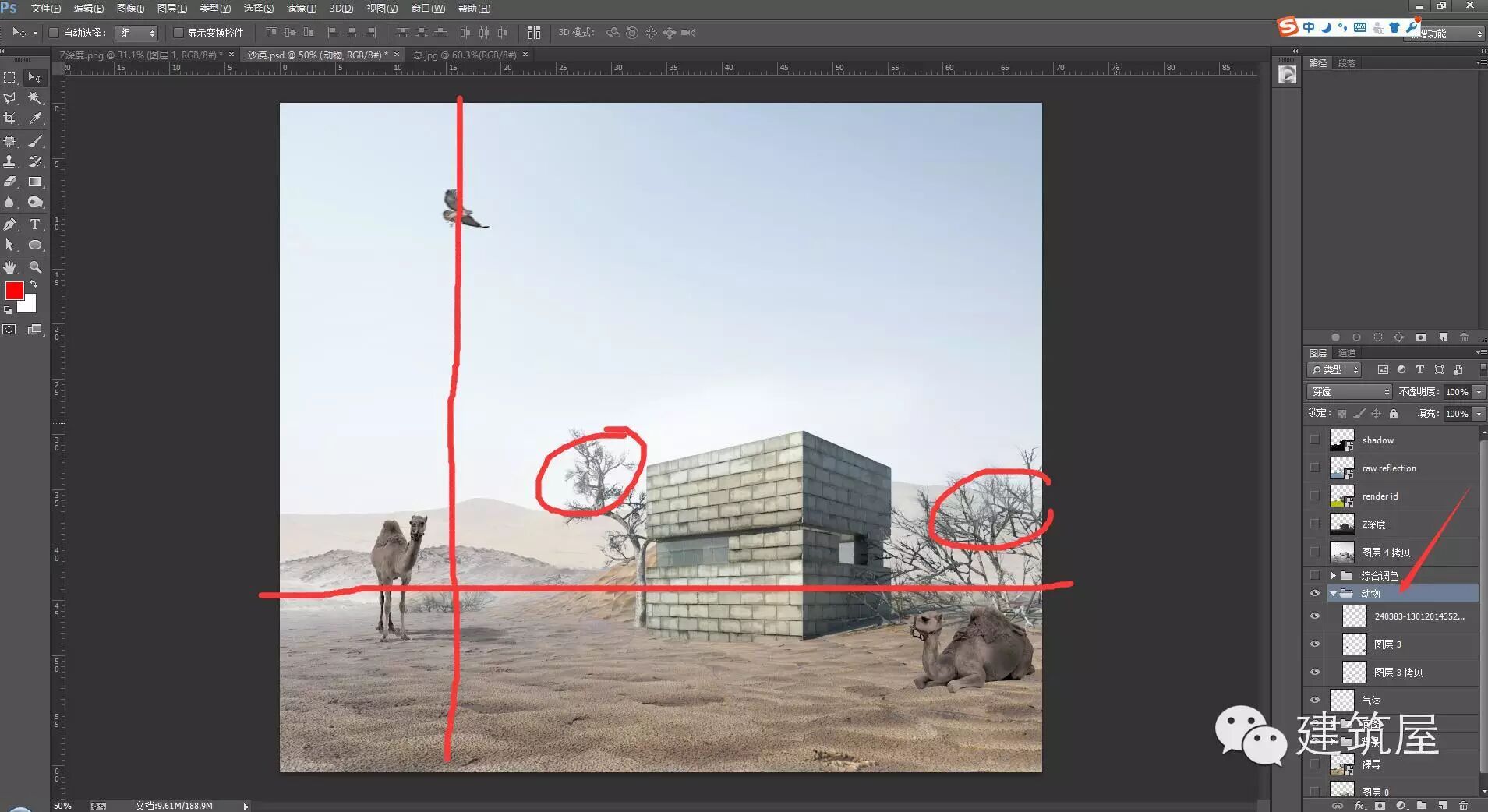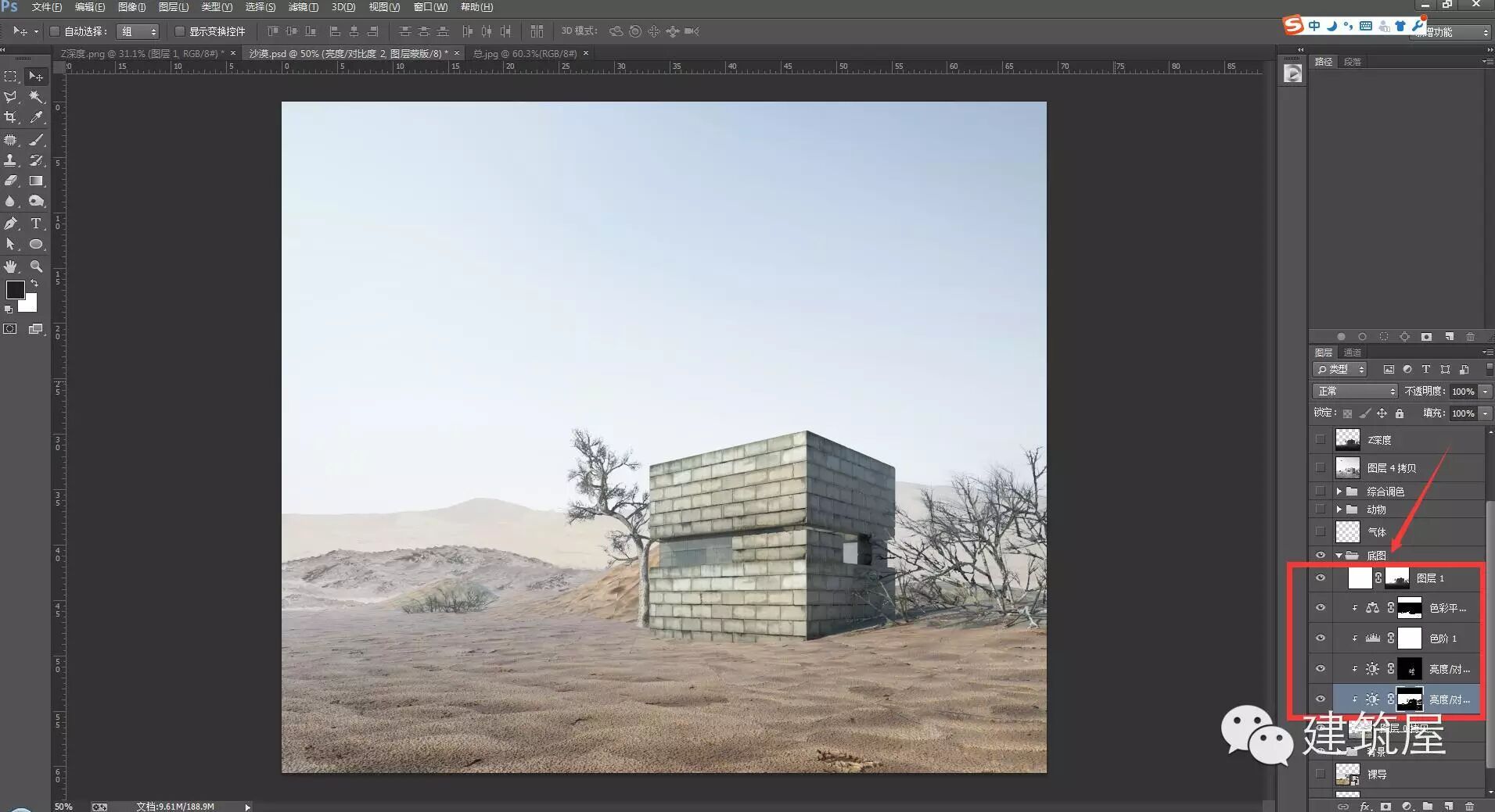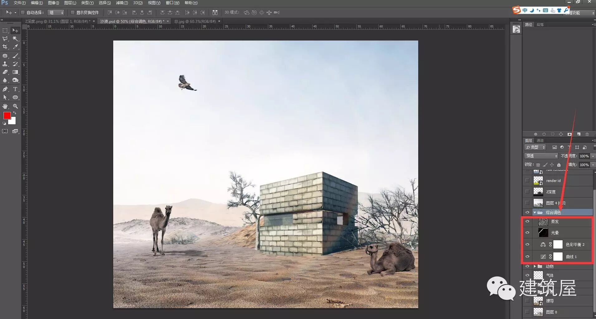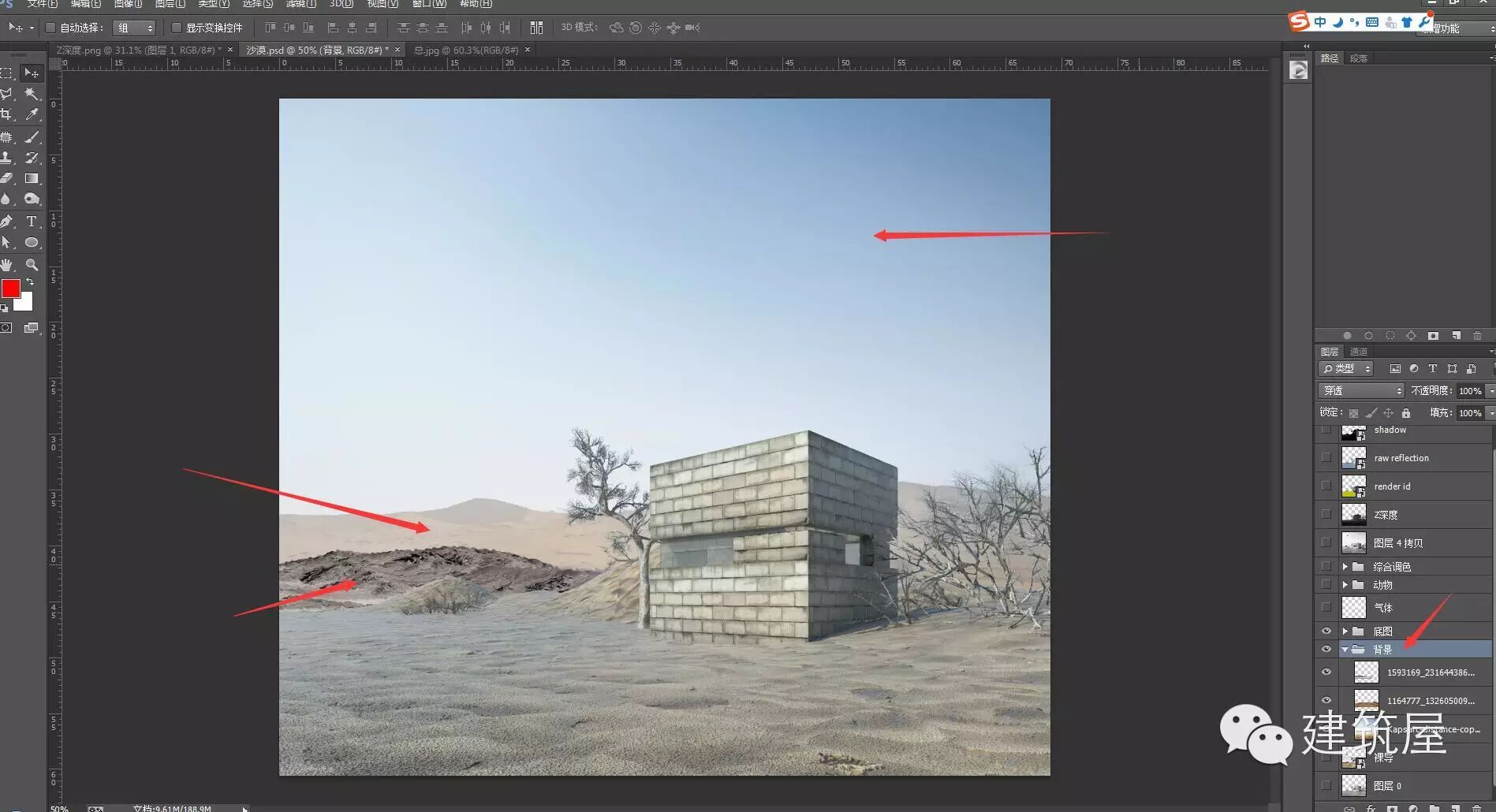底图调整(就是初步调色,在这里我调整了色阶;改变了沙子的色彩平衡让它更加黄和红一点;用shadow通道将画面阴影加深了一点;用Z深度图结合蒙版添加了画面的空气感)