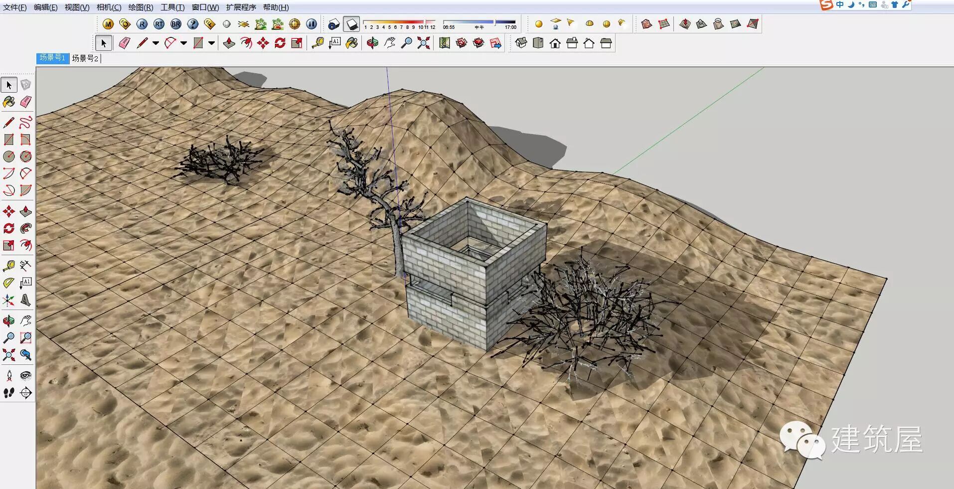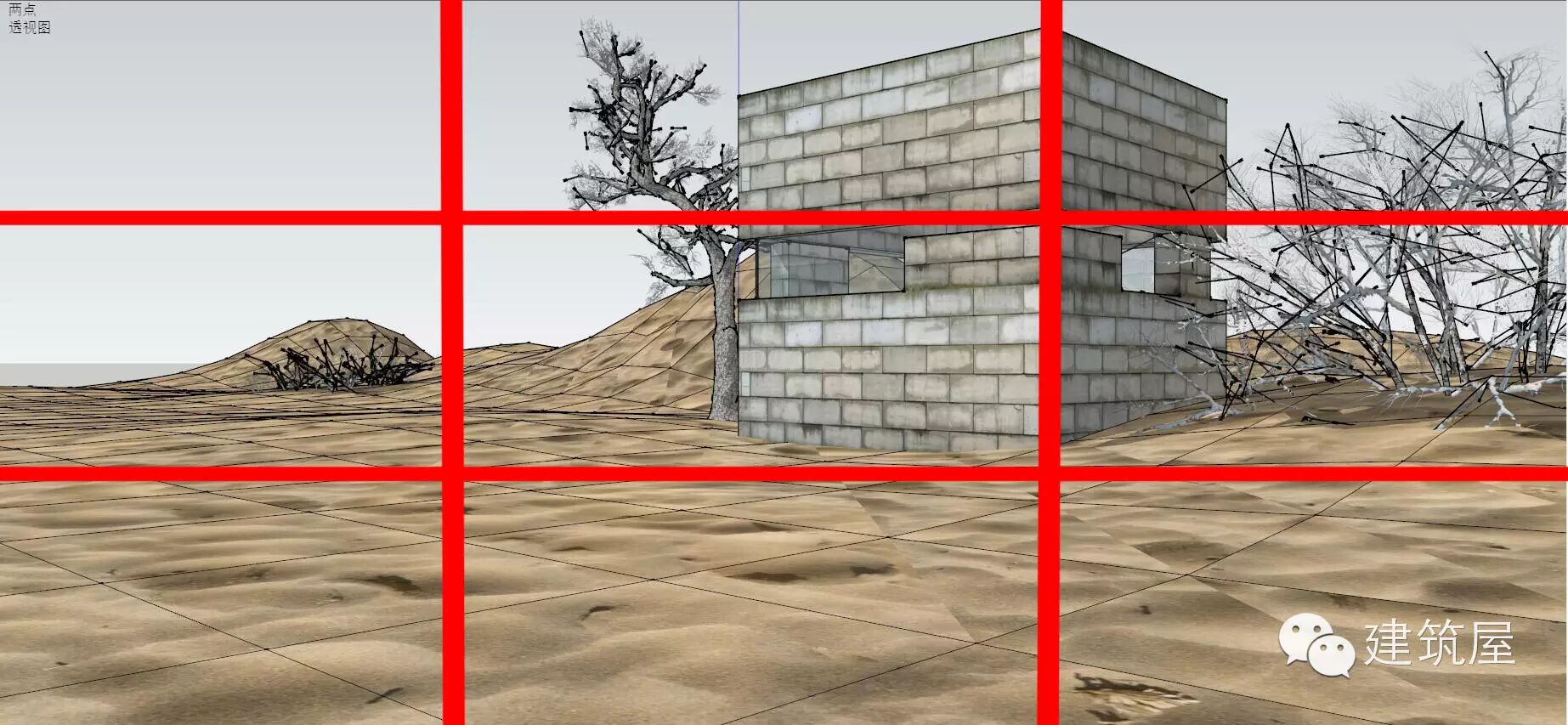 构图在表现中非常重要,好的构图可以让自己的图面加分不少。在这里我采用九宫格法,将表现的建筑主体放在交点上。树木的选择也是为了突出整体的气氛而摆放的(由于场景比较简单,所以没有采用后期加树,这样做可以更加真实的表现场景)由于事先想好了角度所以模型只做了在特定角度能够看到的东西,这样可以节省电脑资源。